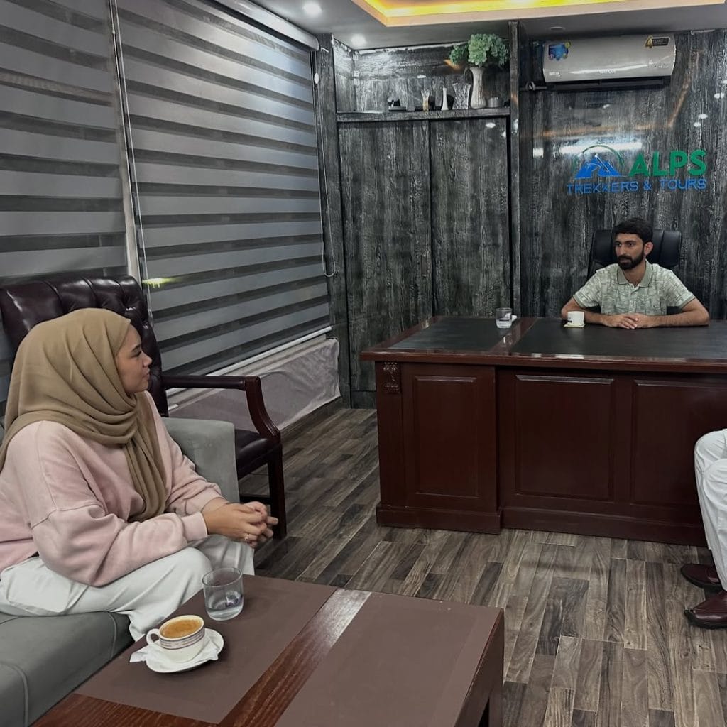 Yuliany Fahra Putri (kiri) saat berbincang dengan Direktur Utama ALPS Tours, Muhammad Umar Khanzada, di Pakistan. (FOTO: Instagram @alps_tours)