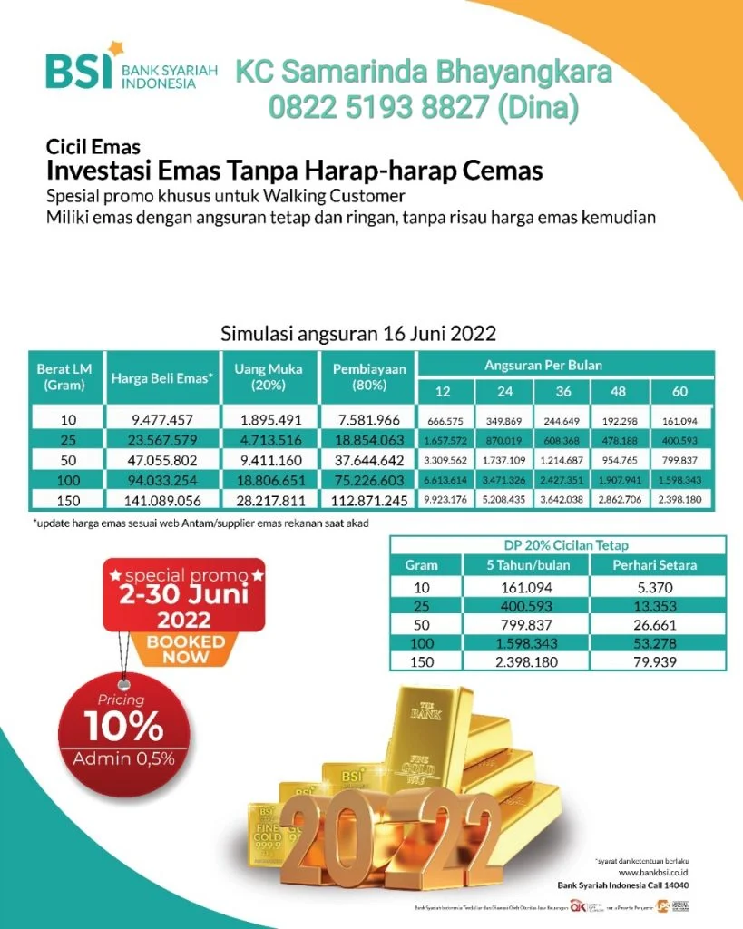 KLIKSAMARINDA – Layanan kepemilikan emas melalui BSI Mobile dengan pembelian emas mulai dari Rp50.000. Anda bisa beli, jual, transfer, serta tarik fisik emas dan gadai emas online dengan mudah dan aman tanpa perlu datang ke Cabang. Penasaran? Kamu bisa cek informasi lengkapnya dengan mengontak 0822-5193-8827 (Dina). (*)